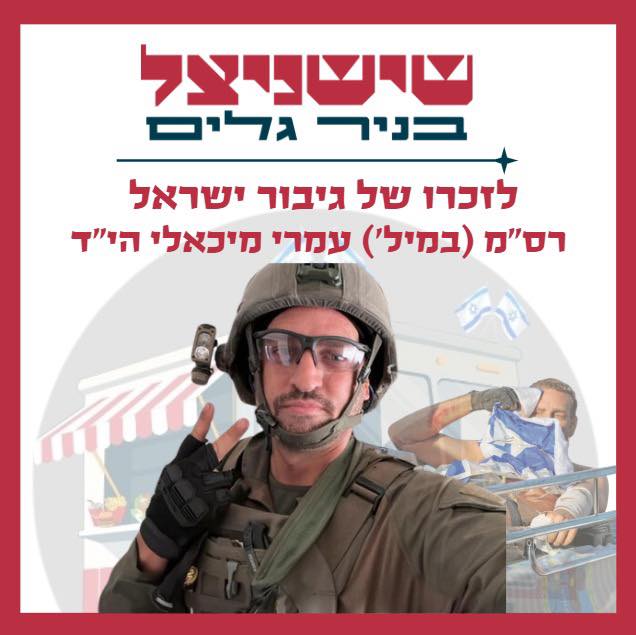 השבוע ננציח את גיבור ישראל – רס״מ (במיל׳) עמרי מיכאלי הי”ד. עמרי שירת כלוחם ביחידת דובדבן, ושב שוב ושוב אל המערכה גם לאחר שנפצע מספר פעמים במהלך שירותו, מתוך אחריות עמוקה לחבריו ולעם ישראל. במבצע "צוק איתן" גילה גבורה יוצאת דופן, ועל כך עוטר בצל"ש הרמטכ"ל. תמונתו על האלונקה בזמן הפינוי לבית החולים, מחזיק בדגל…