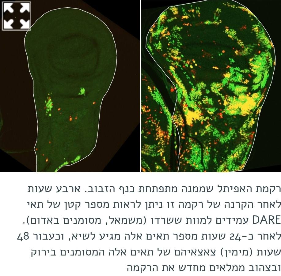 רקמת האפיתל שממנה מתפתחת כנף הזבוב. ארבע שעות לאחר הקרנה של רקמה זו ניתן לראות מספר קטן של תאי DARE עמידים למוות ששרדו (משמאל, מסומנים באדום). לאחר כ-24 שעות מספר תאים אלה מגיע לשיא, וכעבור 48 שעות (מימין) צאצאיהם של תאים אלה המסומנים בירוק ובצהוב ממלאים מחדש את הרקמה.